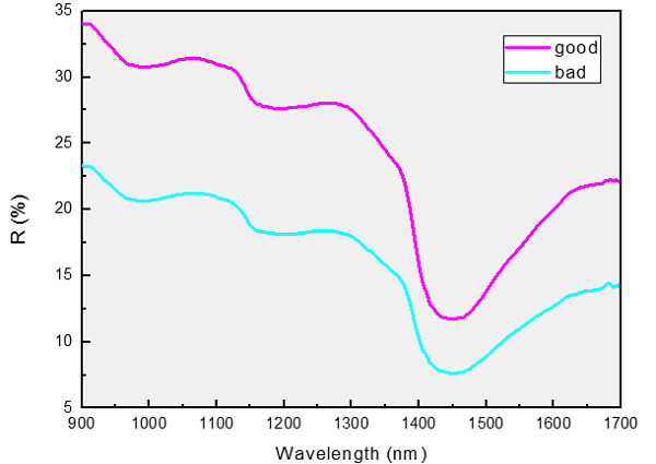 表面完好(good)以及表面有损伤(bad)的水蜜桃,分别在980nm、1160nm以及1450nm附近有较宽的吸收峰,而且,容易看出表面完好的水蜜桃,在1450nm位置的吸收峰要明显大于表面有损伤的水蜜桃。